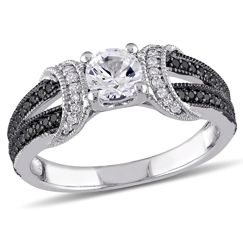 Captivating and bold, this engagement ring showcases a 5/8ct TGW created white sapphire at its center. The sterling silver split shank band, enhanced with black rhodium, features a striking array of 1/4 CT TW black and white diamonds. This unique design offers a perfect blend of elegance and modern flair, making it a stunning choice for an unforgettable proposal.