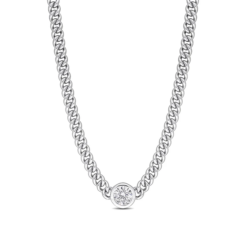Expand your collection with this trendy created sapphire necklace. Expertly crafted in lustrous sterling silver, this unique necklace features one round bezel-set white sapphire gemstone attached to a 16-inch curb link chain on a spool. Polished with a brilliant finish, the necklace fastens securely with a lobster clasp with a ring. Use this necklace for a bold and beautiful look.