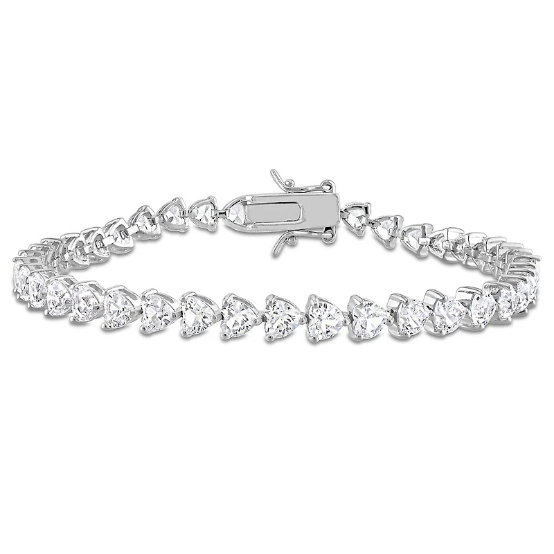 Express your true feelings with this opulent Tennis Bracelet. Crafted in shimmering sterling silver, this sumptuous bracelet features 38 heart-cut created white sapphire gemstones (4x4mm). Enhanced with a high polished finish, this splendid 7.5-inch bracelet is secured with a lobster clasp. This ravishing bracelet will capture the most beautiful moments and always remind her of your commitment.
