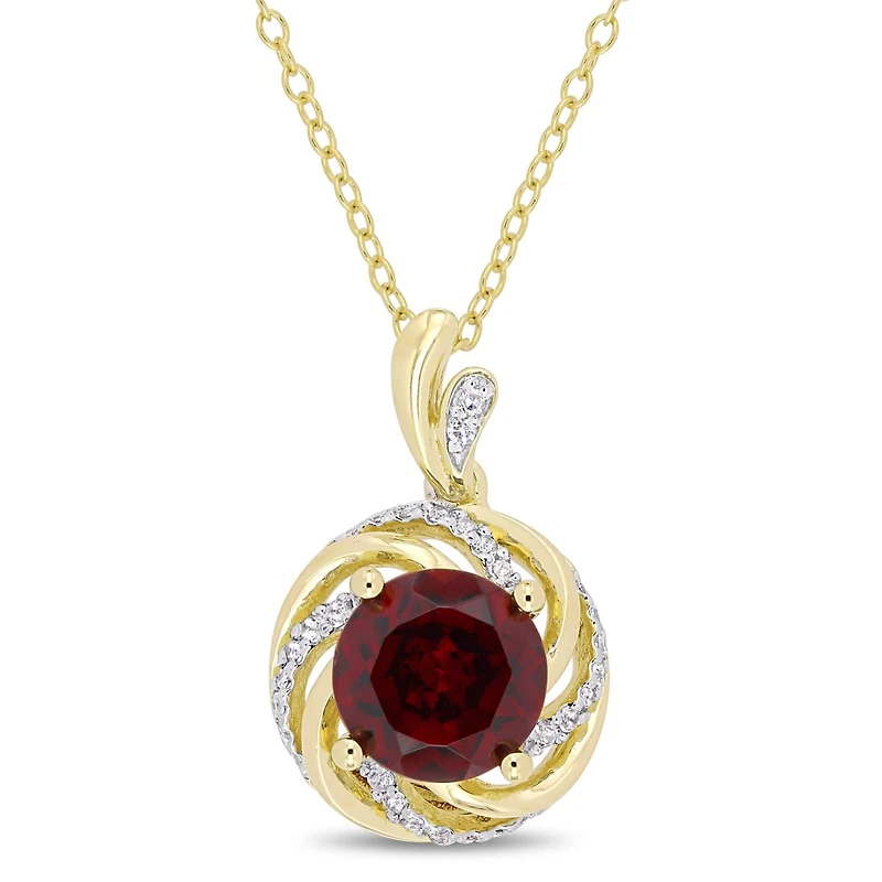 This dainty swirl halo gemstone necklace is set in yellow plated sterling silver and features a round-cut, prong-set garnet at the centre of its 28 round-cut, buttercup-set white topaz and diamond accent swirl halo design. A modern take on the classic round halo design, this stunning necklace is sure to make a versatile addition to any jewellery collection. Instantly add a touch of elegance and colour to any look with this lovely gemstone and diamond necklace. Choose this style as a perfect gift for that special January birthday in your life.
