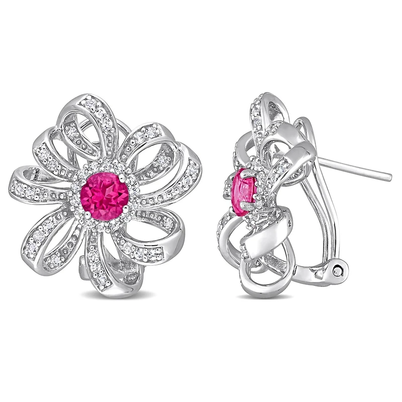 These elegant floral earrings are mounted in lustrous sterling silver. These charming earrings feature two prong-set, pink topaz gemstones as the centre and the petals showcase 28 prong-set and 48 pave-set white topaz gemstones. Polished to a brilliant shine, these sophisticated earrings are perfect for the woman who likes to keep it light yet stylish.