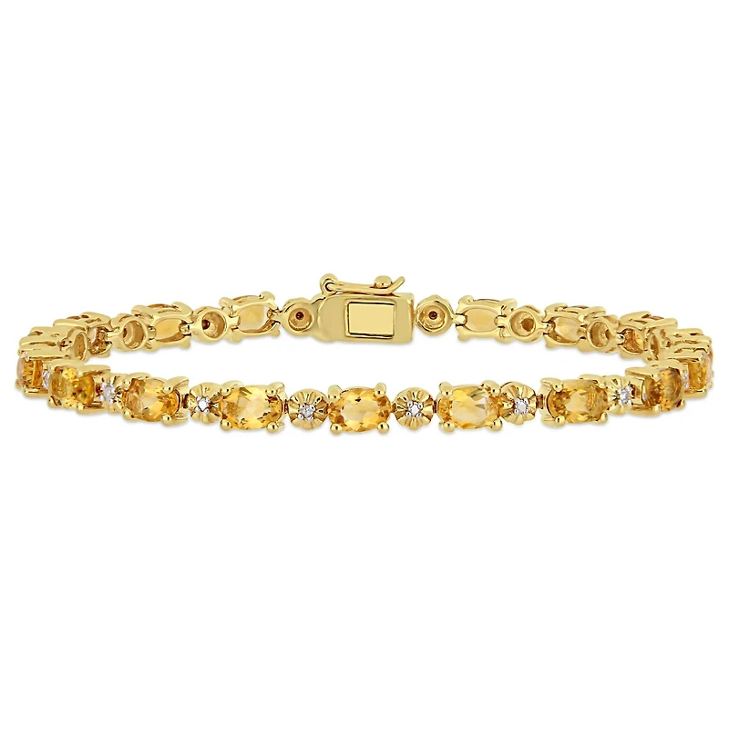 This stunning citrine and diamond bracelet is crafted in lustrous yellow plated sterling silver and features 18 oval-cut citrine stones paired with two glistening diamonds in a classic tennis link design. Add a touch of colour and elegance to any ensemble with this gorgeous gemstone and diamond bracelet.