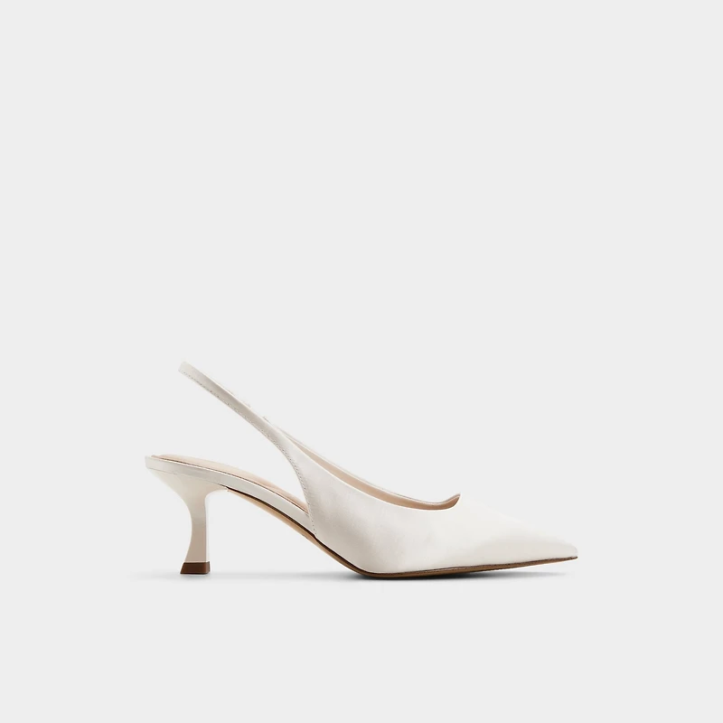 Elegant white satin slingback kitten heel designed for bridal events and special occasions. The delicate slingback strap provides a secure fit, while the modest kitten heel offers all-day comfort without sacrificing sophistication. Perfect for weddings, rehearsal dinners, and formal celebrations where timeless style matters.