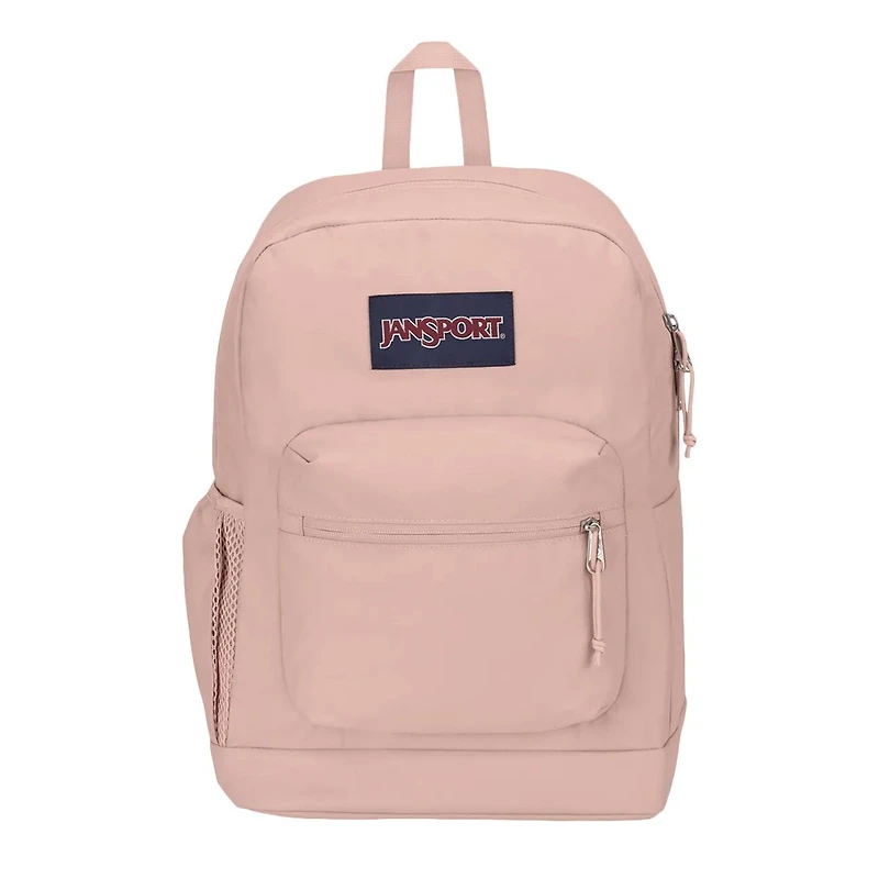 Carry your essentials and valuable tech in style with Jansport kids' Cross Town Plus blush backpack. Made of 100% recycled polyester 600 denier, this backpack provides durability and promotes sustainability. It has top zip closure with corded pulls that opens to reveal a spacious compartment with padded sleeve that fits a 15" laptop. This backpack has padded bottom, front utility zipper pocket and side water bottle pocket to arrange your essentials. Fully padded back panel, web haul handle, and straight-cut padded, adjustable shoulder straps offer comfortable carrying experience.