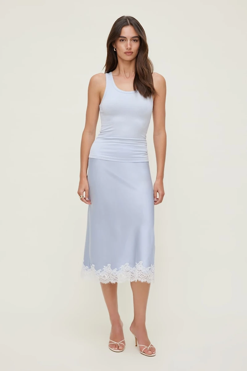 This skirt is made from silky satin with a hint of stretch for an effortless, flowy drape that moves with you. It's designed to sit at your waist with a relaxed fit and has a lace trim for a sultry touch. Style it with a
