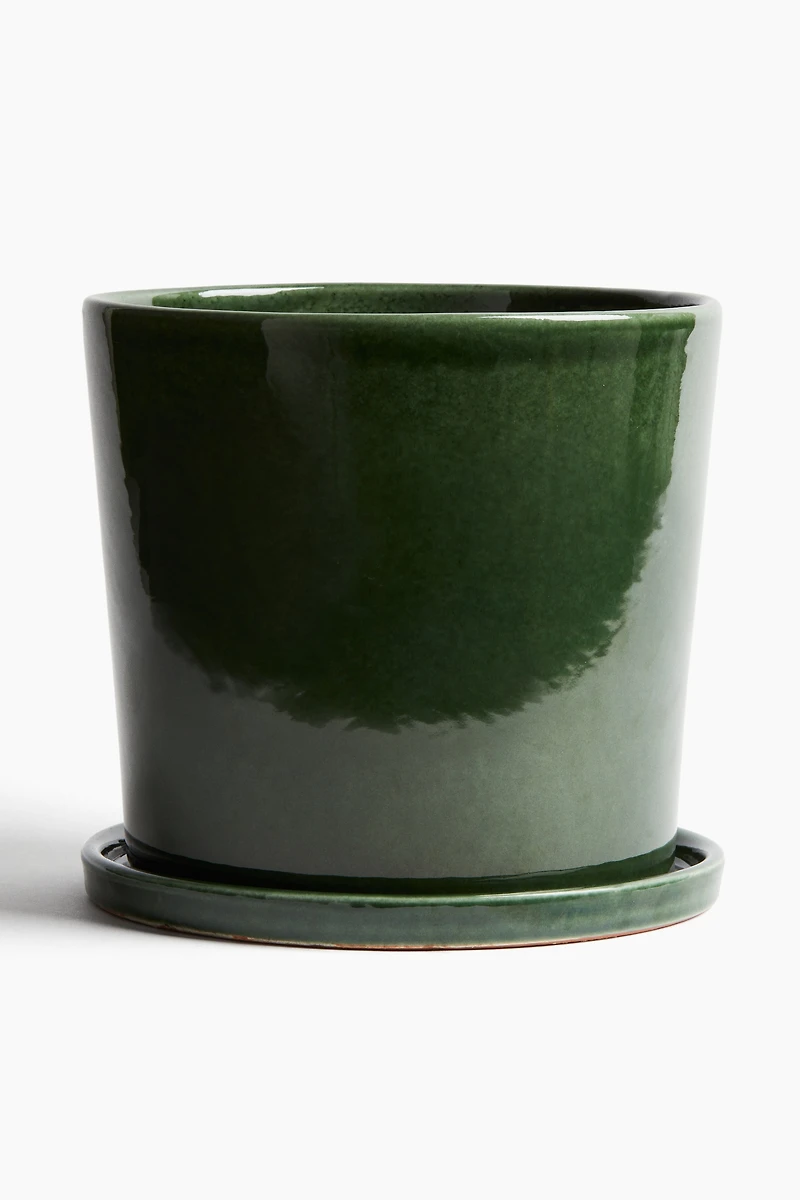 Large plant pot in glazed terracotta with a drainage hole at base. Matching saucer. Diameter of saucer 9 in. Height of pot 9 in. Diameter at top 8 1/4 in.