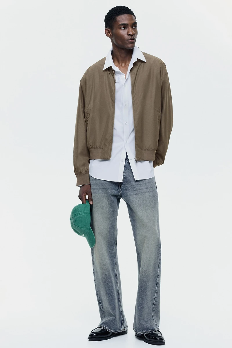 Lightweight bomber jacket in woven fabric. Ribbed stand-up collar, zipper at front, and diagonal welt side pockets with concealed snap fastener. Wide ribbing at cuffs and hem. Lined.