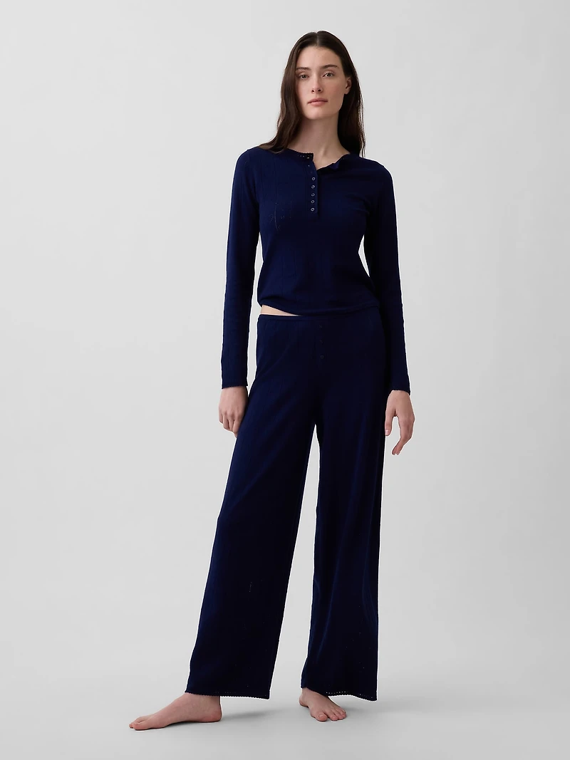 Supersoft, lightweight knit pajama pants. Elasticized waist with faux button fly. Allover pointelle-knit heart design. Scalloped rib hem. Made with 25% recycled polyester. Compared to virgin materials, using recycled materials helps reduce resource use and waste.