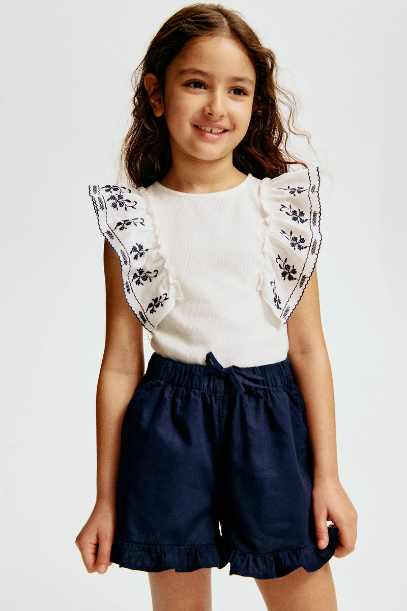 Loose-fit shorts in an airy linen and cotton weave. Elasticated, drawstring waist, diagonal side pockets and frill-trimmed hems.
