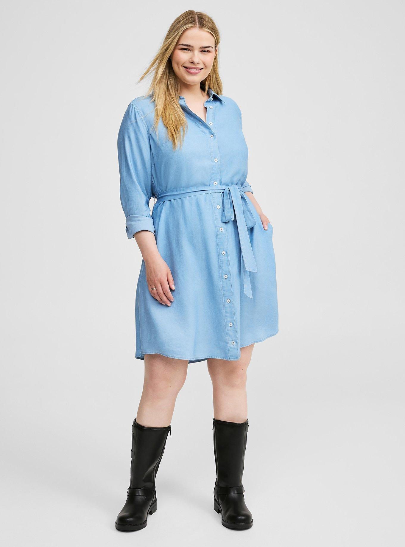 Mini Chambray Long Sleeve Button Front Tie Shirt Dress