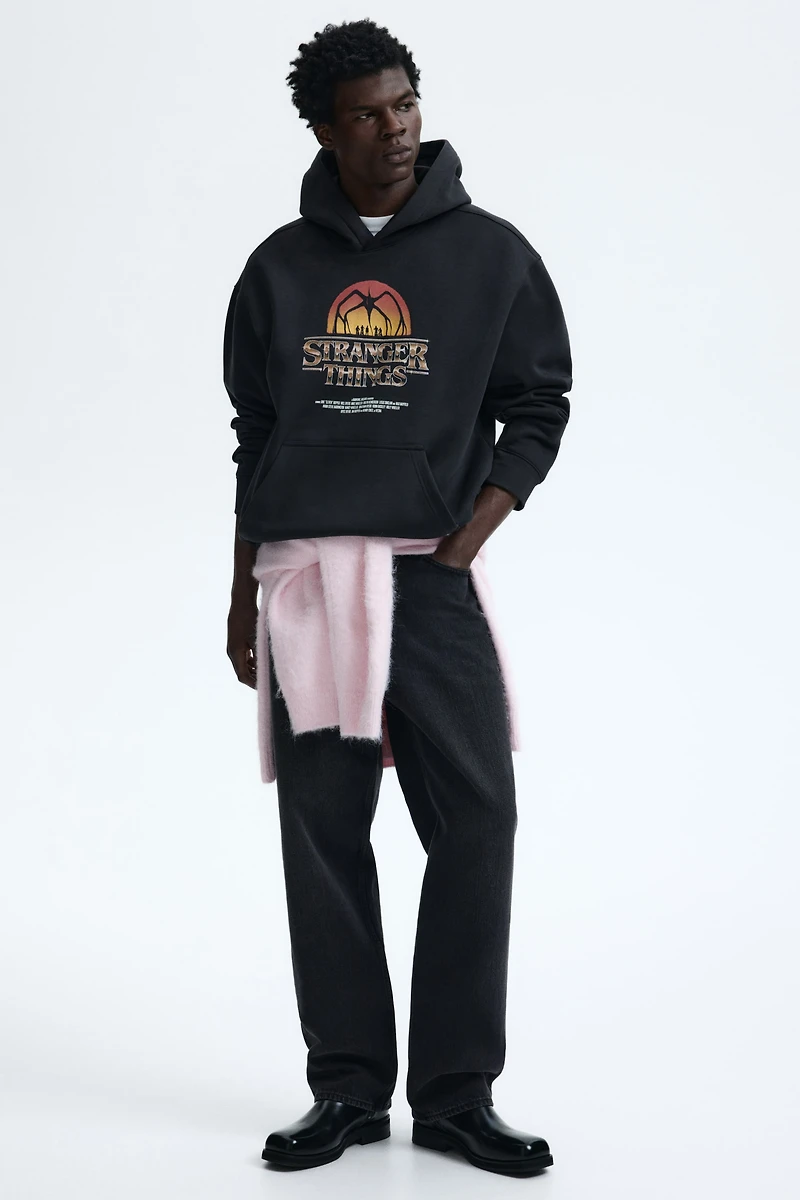 Loose-fit sweatshirt hoodie in medium weight cotton-blend fabric with a generous, but not oversized silhouette. Lined hood, dropped shoulders, long sleeves, and a kangaroo pocket. Ribbing at cuffs and hem. Soft, brushed inside.