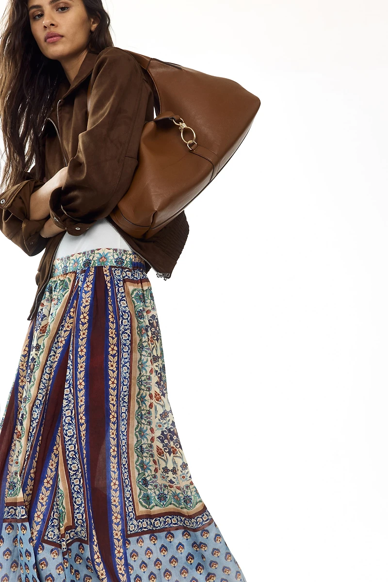 Loose-fit maxi skirt in a woven viscose blend. High waist, covered elastic at back of waistband, and gathers at front.