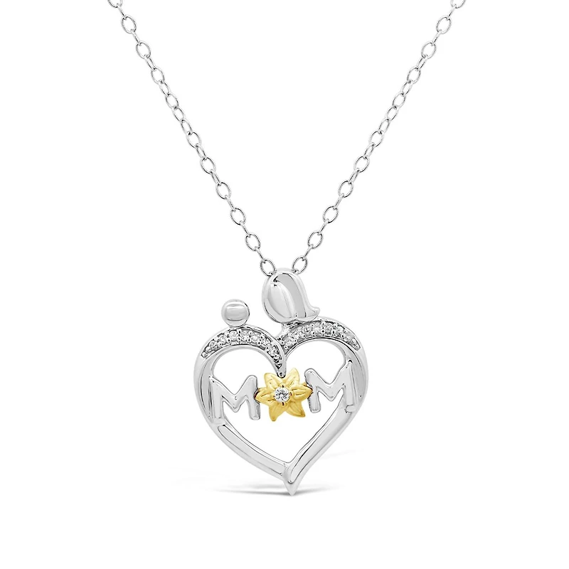 Celebrate the bond between mother and child with the Loving Hearts Diamond Mom and Child Heart Pendant in Sterling Silver. Featuring the silhouettes of a mother and child within a heart, accented by a yellow gold-plated flower and a sparkling diamond, this pendant is a timeless symbol of love and connection.