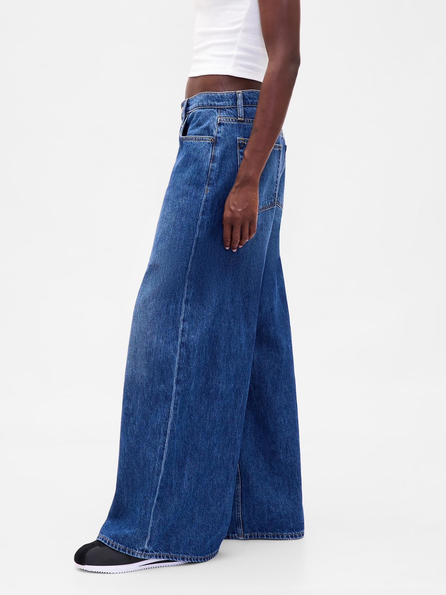 Fit: An full-length baggy jean that's fitted on the waist & relaxed all the way down. Fabric: 95% Cotton, 5% Recycled Cotton. Stretch: No Stretch Jeans. Authentic denim that gets better with every wear. Made to wear all day & break in over time. Rise: Mid Rise Jeans that are low slung in the hips. Look: A five-pocket jean in a dark wash. Details: Zip fly & five-pocket styling. Responsibly Made: This pair of jeans is part of our water-saving Washwell program. Compared with conventional wash methods, Washwell uses at least 20% less water and has saved over a billion liters of water since 2016. Explore our GapJeans Fit Guide. This product was made in a factory that invests in gender equality and women’s empowerment. Through RISE (Reimagining Industry to Support Equality) and Gap Inc. ’s program P. A. C. E. (Personal Advancement & Career Enhancement), we support people who make our clothes to build the skills, knowledge, confidence, and resilience needed to advance in work and life. .Learn more.here.