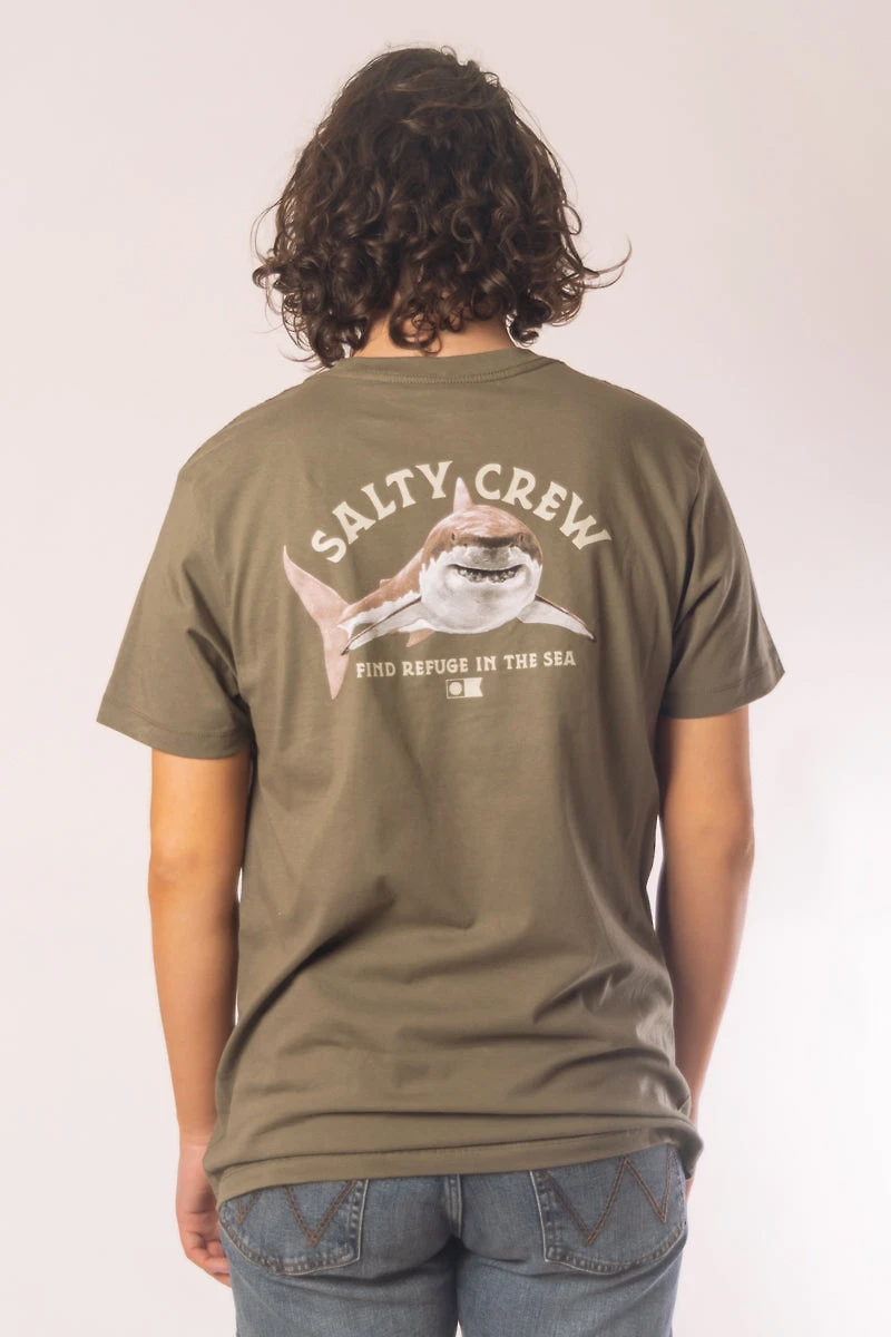 Somebody's watching you! A great white shark is lurking on the back of Salty Crew's premium cotton tee.