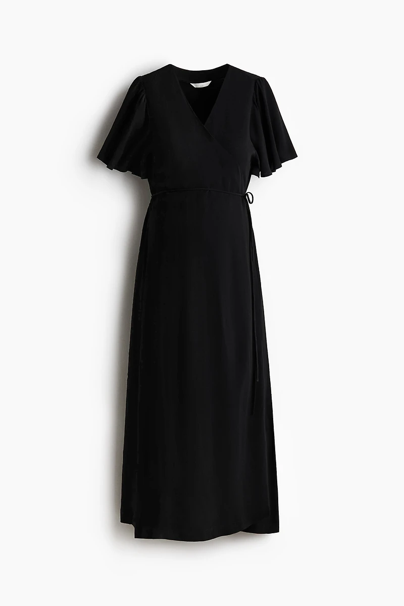 Calf-length nursing dress in an airy viscose weave with a V-neckline, short puff sleeves and a wrapover front with narrow ties under the bust. Fitted bodice and a gently flared skirt. Practical inner top for easier nursing access. Unlined.