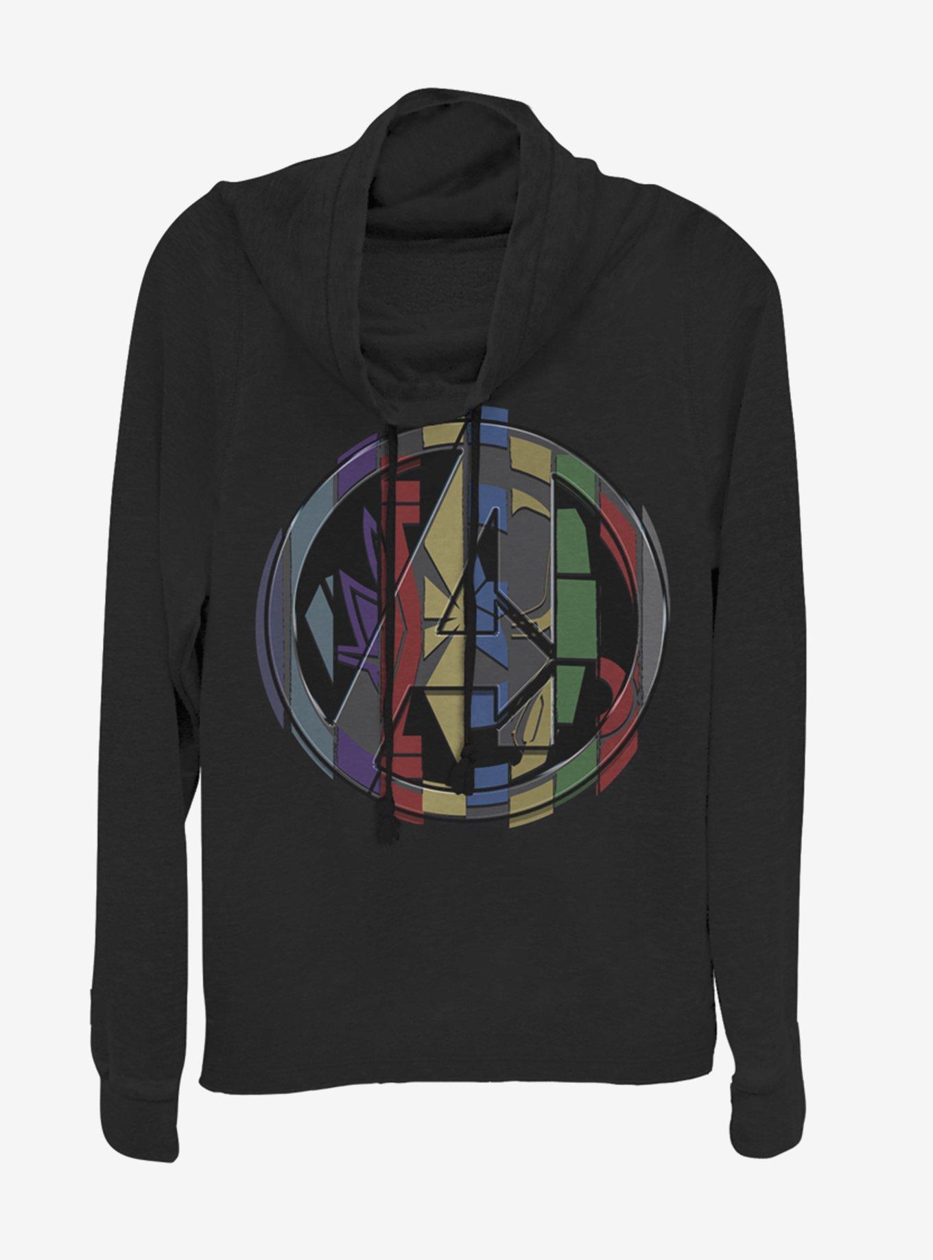 Rep your favorite Avengers - subtly - with this black, lightweight cowlneck sweatshirt. It features the team's A logo filled-in with the colors and badges of those iconic superheroes.
