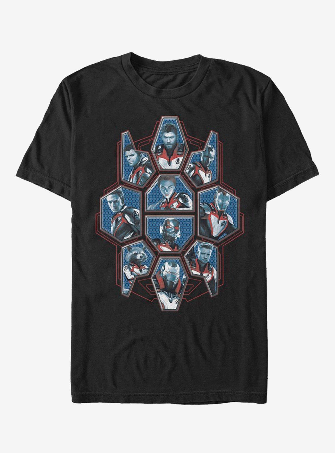 The power of ten. This black T-shirt features a grid of the Avengers, inspired by basically the best movie ever - Avengers: Endgame!