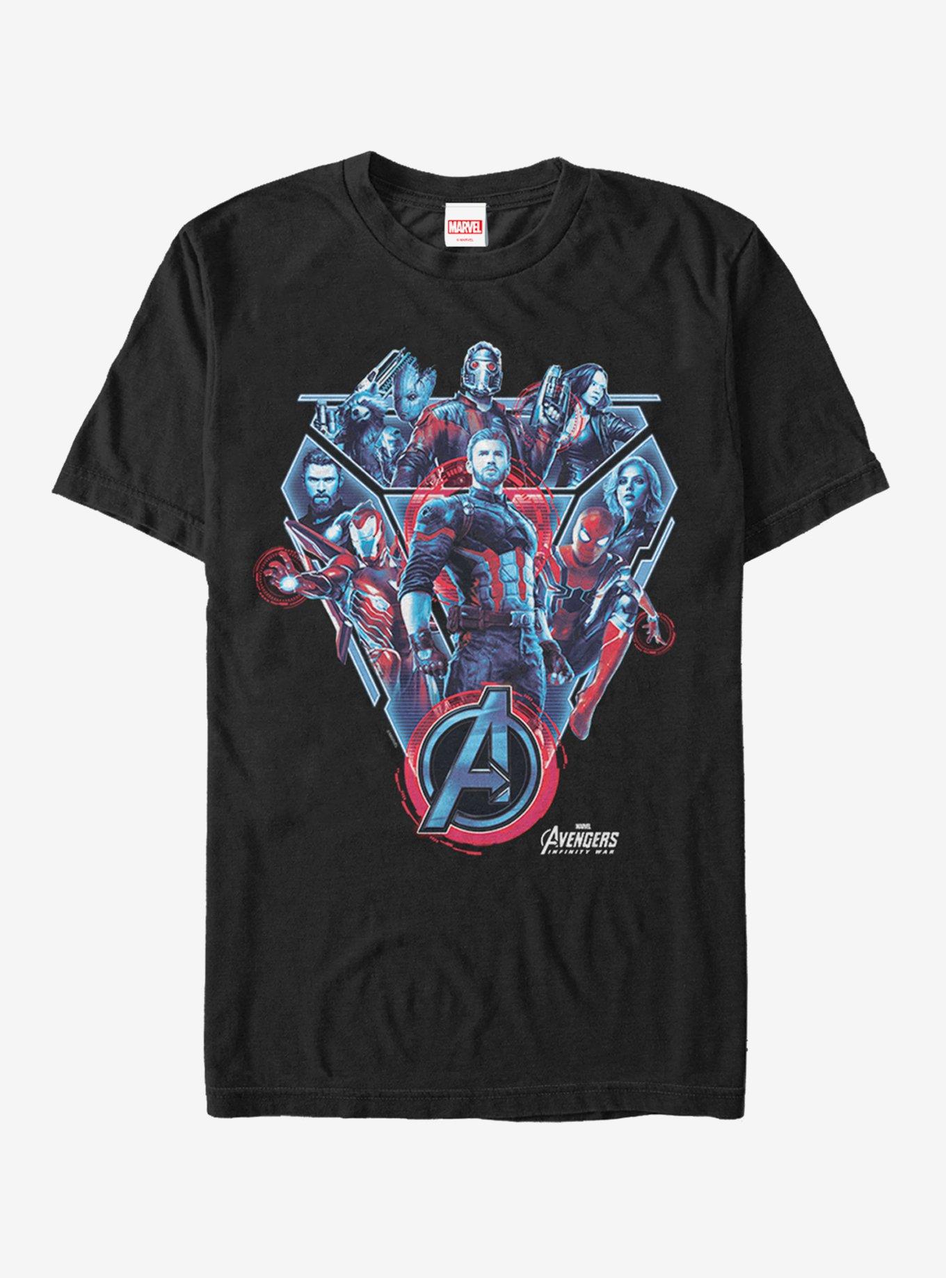 Get ready for the battle of a lifetime with the Marvel Avengers: Infinity War Armor Men's T-Shirt. The Avengers like Captain America, Thor, Black Widow and more are portrayed with the Guardians of the Galaxy in a cool chest armor style print across the front of this Marvel shirt.