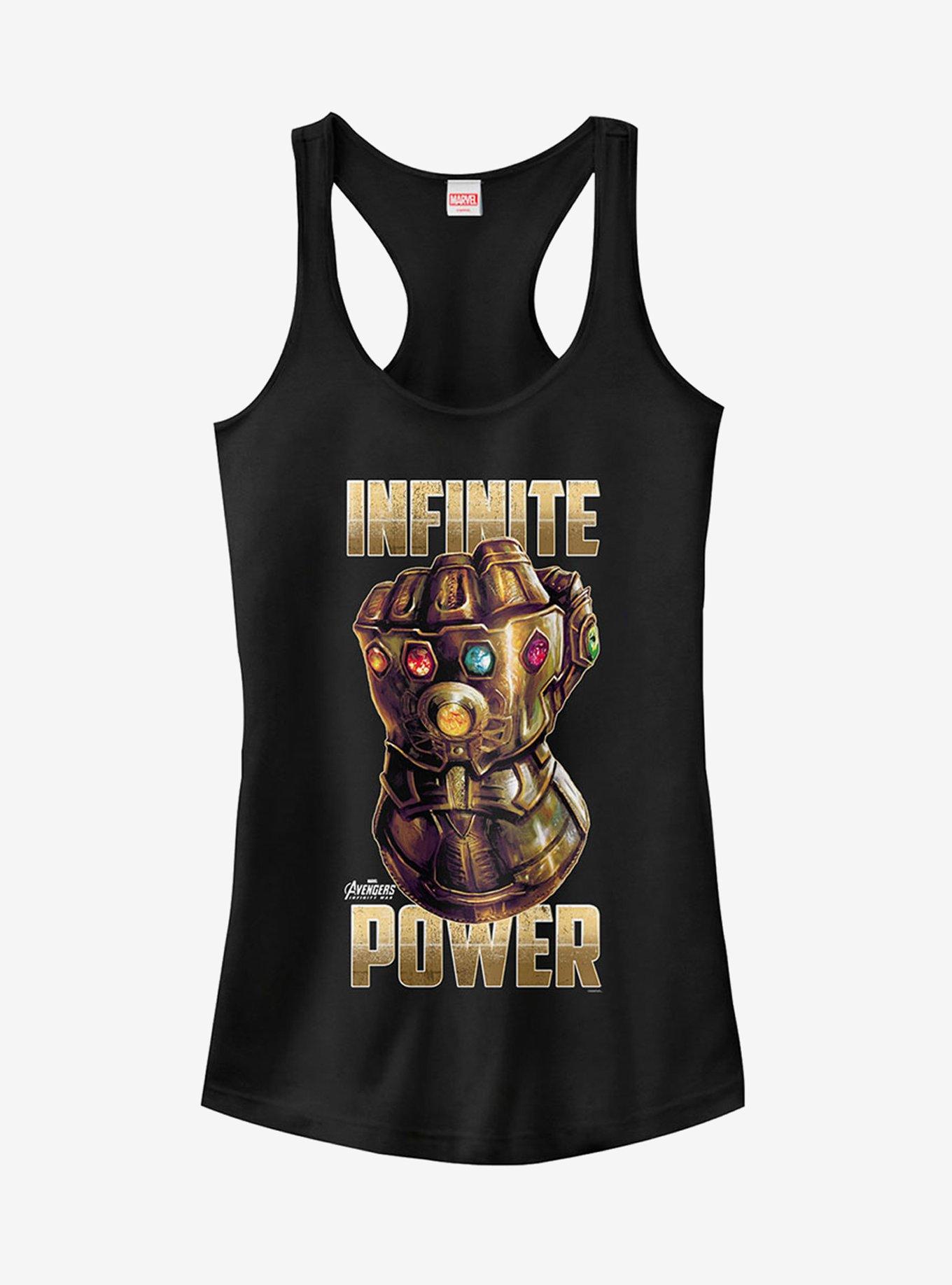 Thanos will do whatever it takes to control Earth and only the Avengers and the Marvel Avengers: Infinity War Gauntlet Power Juniors' Racerback Tank Top can stop him. Thanos' gauntlet glove shows off the six powerful infinity stones on this Avengers: Infinity War tank top that reads "Infinite Power" across the front.