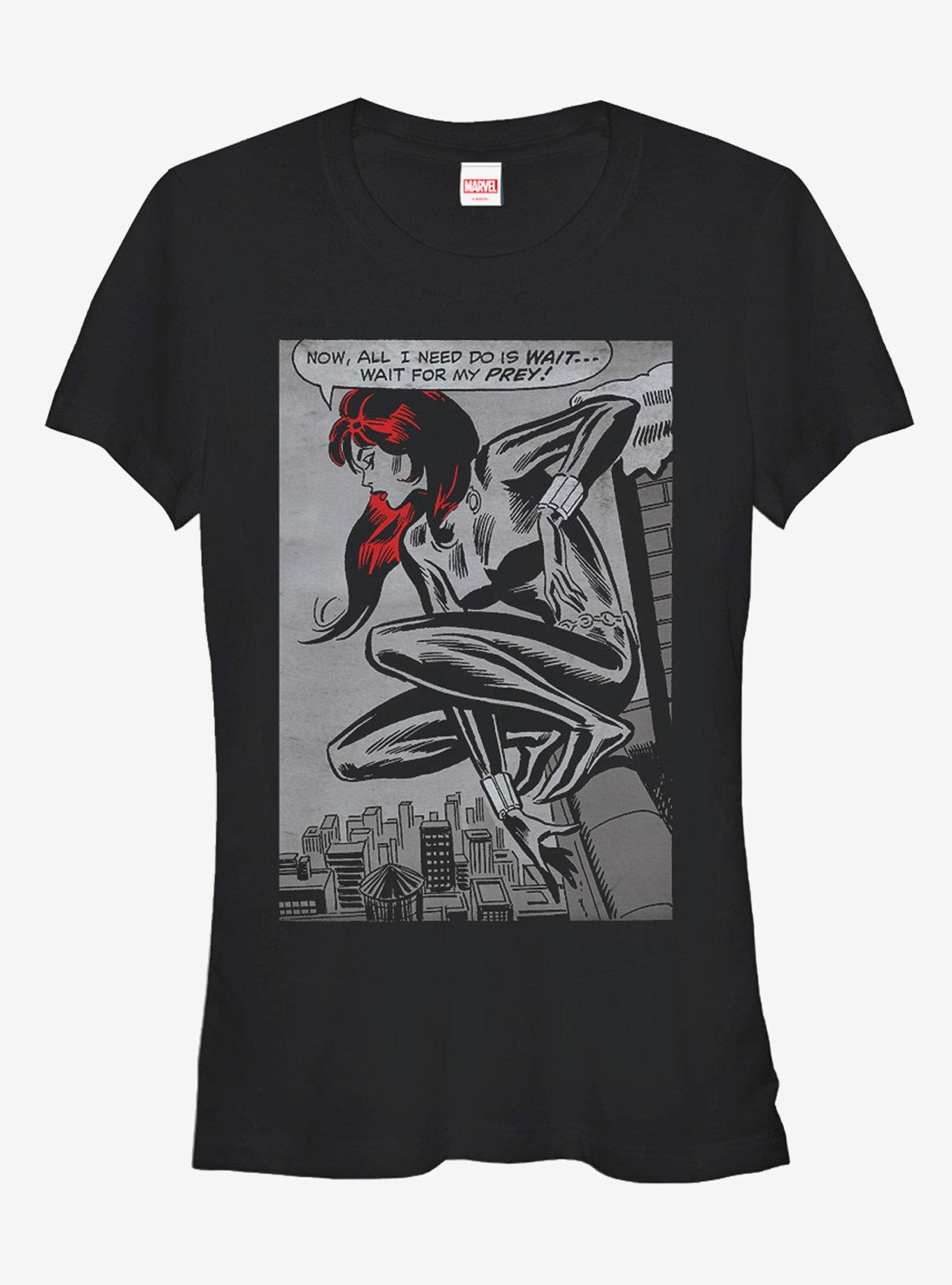 Beware the Widow's Bite for she is waiting for her prey with the Marvel Black Widow Wait for Prey Black T-Shirt. This fitted black tee features a comic book style Natalia Romanova lurking high on a skyscraper with her red hair flowing around her and the speech bubble "Now, all I need do is wait...wait for my prey" above her. 100% Cotton. Runs small, size up.