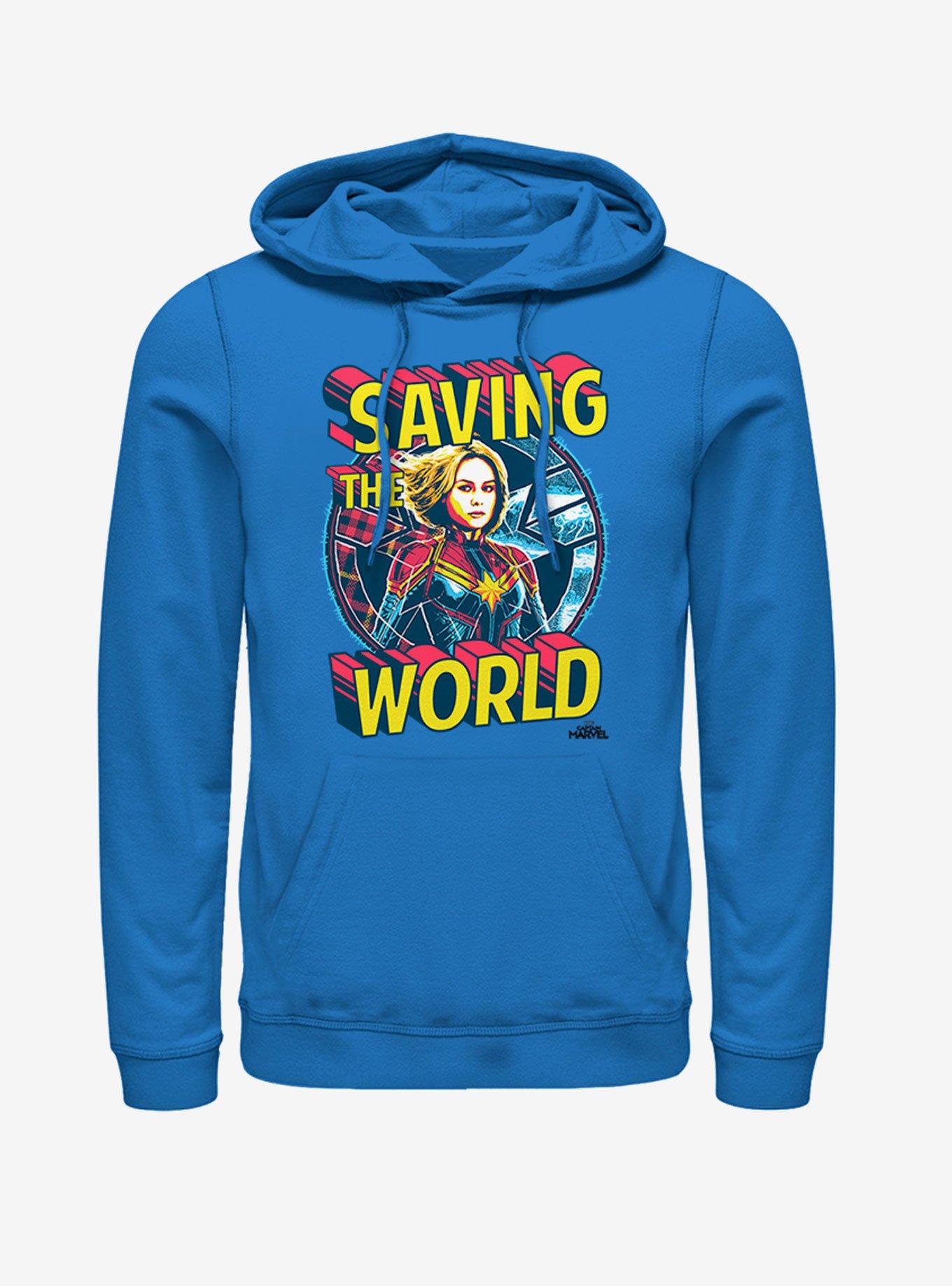 Need a (her)o? Captain Marvel is here - saving the world - on this royal blue hoodie.