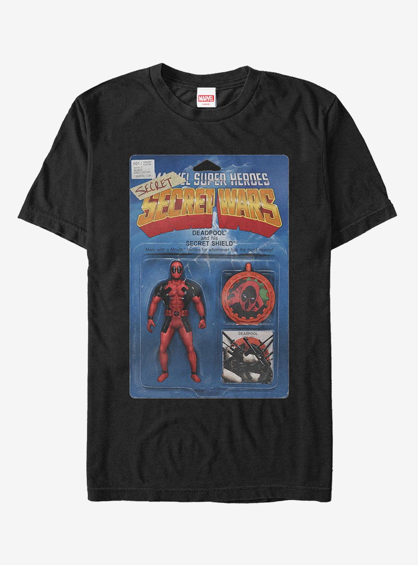 So secret they had to make sure it was written twice. It's super secret! Hopefully not so secret that Deadpool forgets about it, though! Featuring a print of Deadpool as an action figure in the Secret Wars.  60% cotton; 40% polyester Wash cold; dry low  Imported Listed in men's sizes