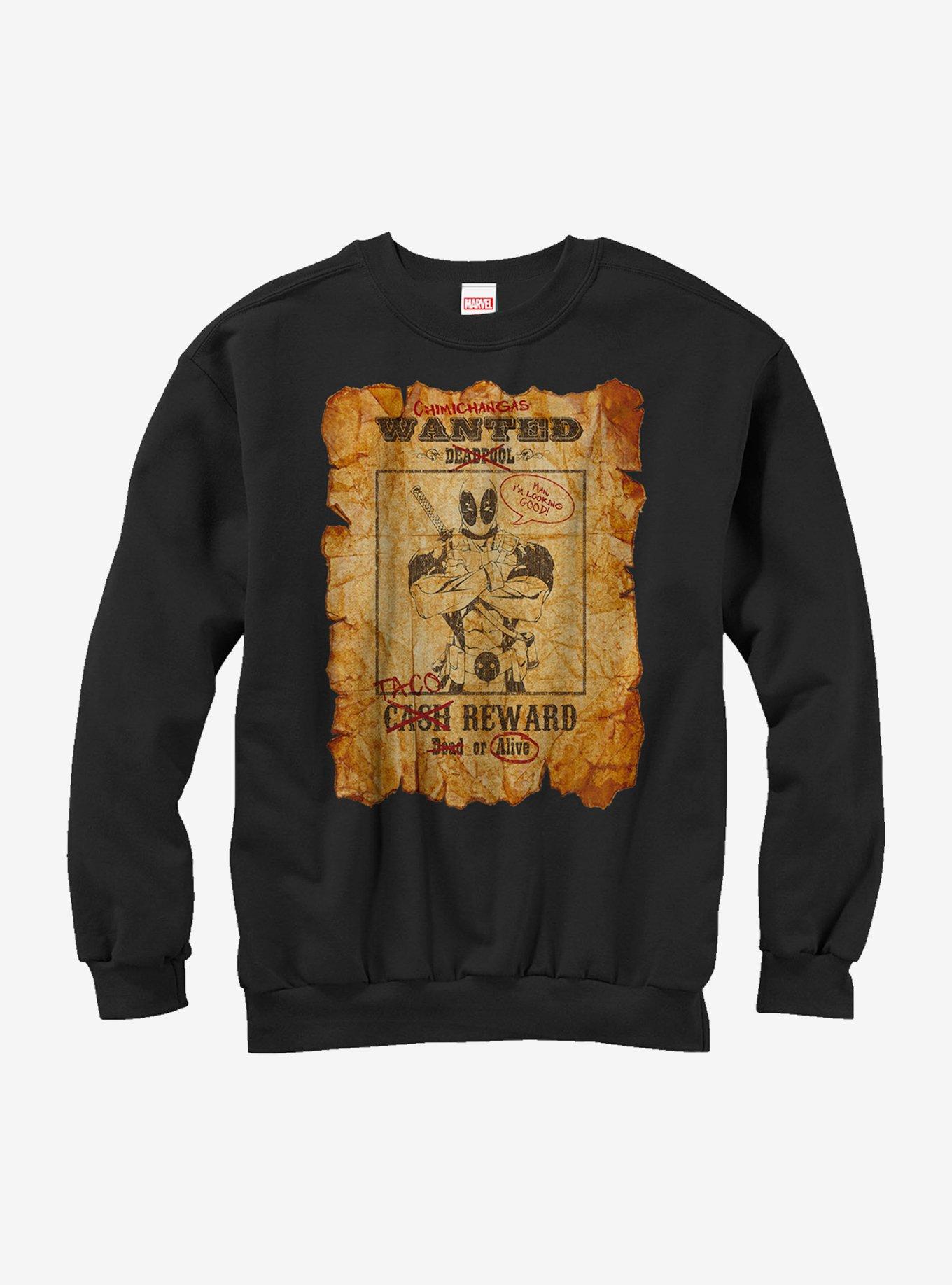 Whether you're looking for Deadpool or chimichangas, get the word out with this sweatshirt! A wanted poster printed on the front of this black sweatshirt has been edited by Deadpool himself to be about chimichangas and tacos.
