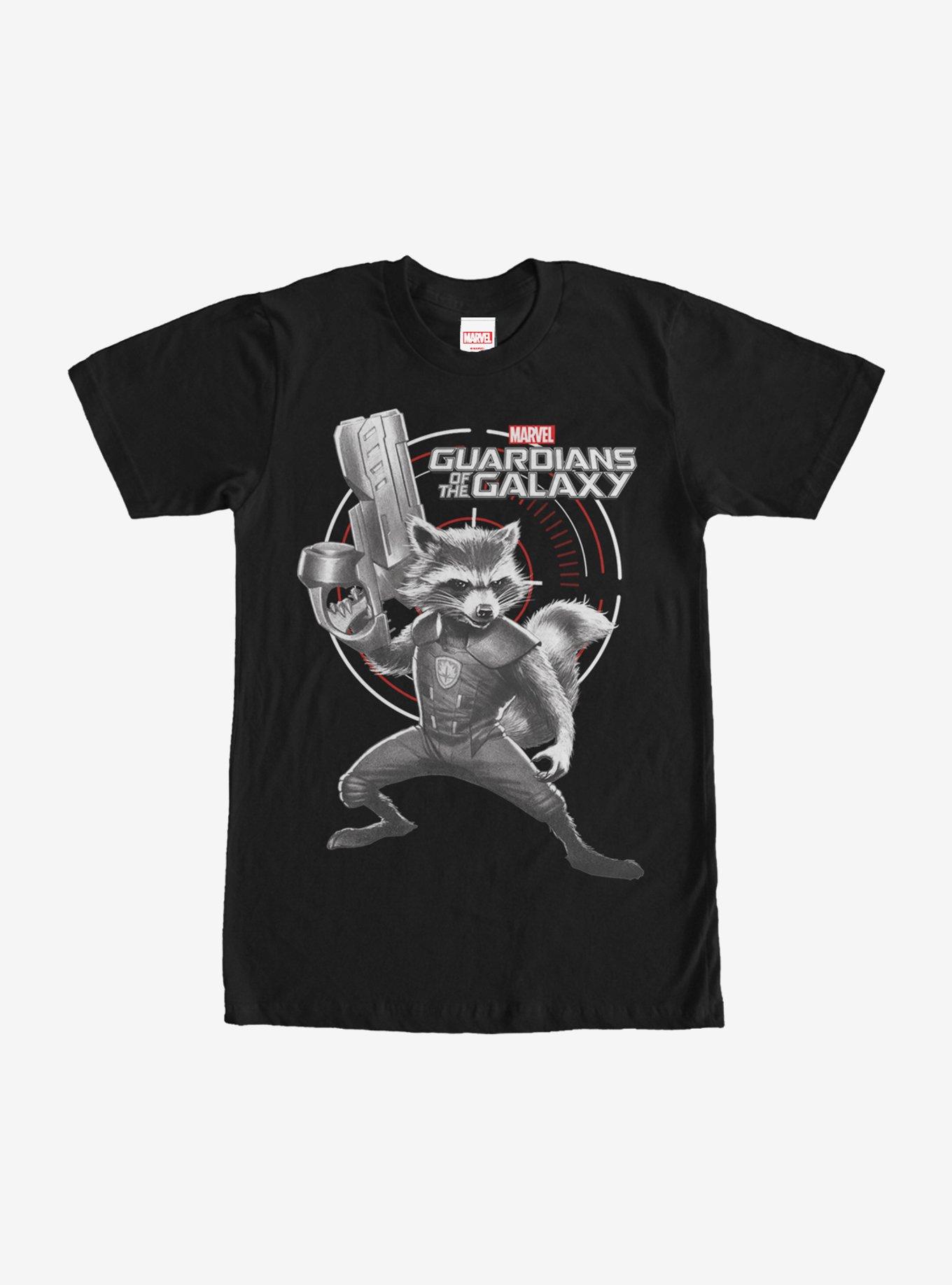 Rocket is an unstoppable bounty hunter on the Marvel Guardians of the Galaxy Rocket Target Black T-Shirt. Your favorite furry Guardian is printed in grayscale in front of a red and white gun scope for telescopic sight. 100% Cotton.