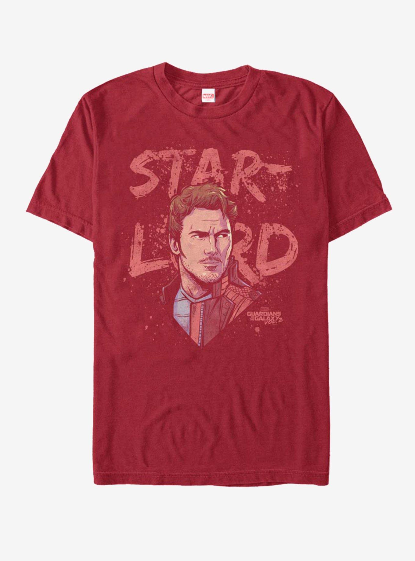 Show off one of the most famous faces in the galaxy with the Marvel Star-Lord Guardians of the Galaxy Vol. 2 Speck Cardinal Red T-Shirt! Peter Quill is printed across this cool red Guardians of the Galaxy Volume 2 shirt, with "Star-Lord" styled in a fun paint-speck pattern down the front. 100% Cotton.