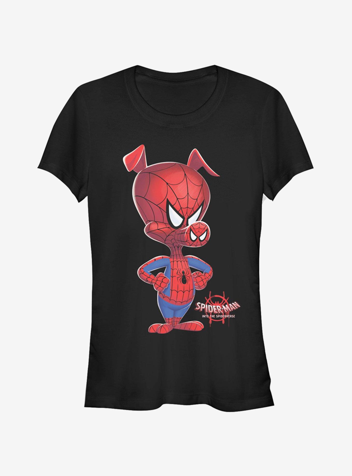 He's become something greater than either spider or pig... he's become Spider-Ham! This fitted black tee features your favorite anthropomorphized superhero from the Spider-Verse screened on the front.