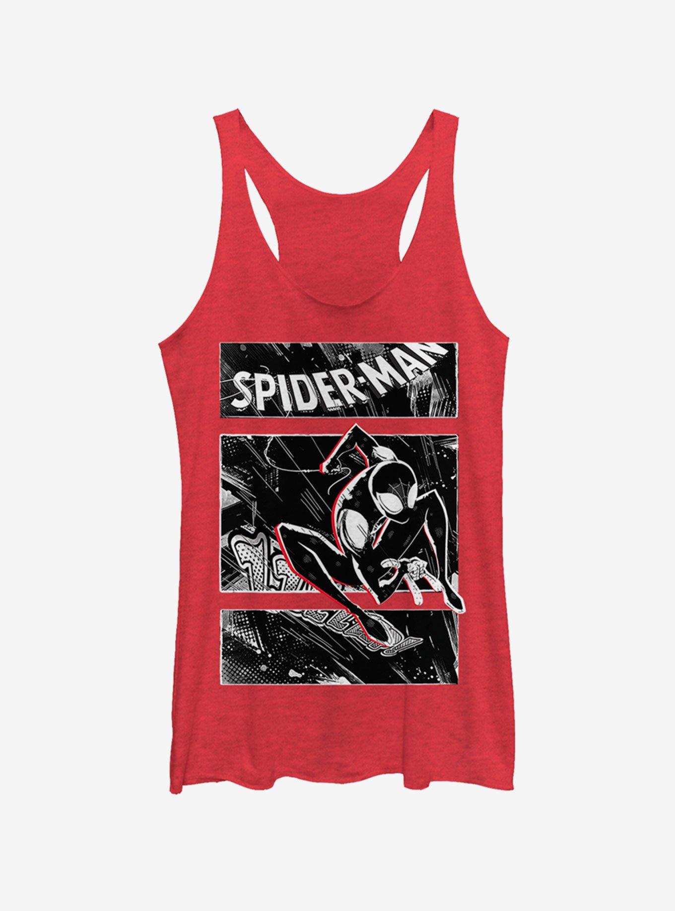 The comic you can wear. This heathered red tank features Spidey swinging high above the city streets.