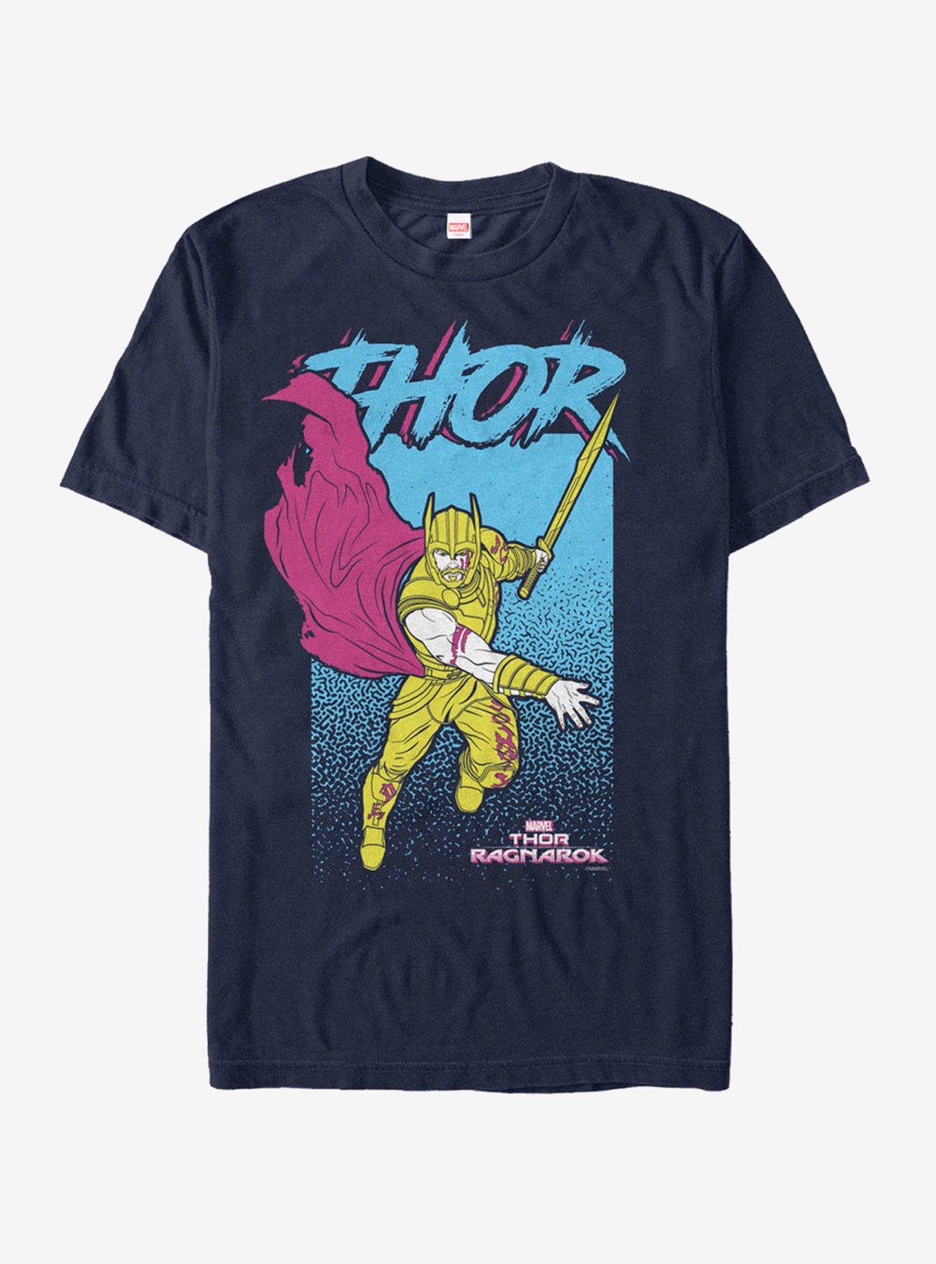 Head into the gladiator ring in style with the Marvel Thor: Ragnarok Cape Navy Blue T-Shirt! Thor is shown in yellow and pink, while his cape billows behind him, on this awesome blue Thor Ragnarok shirt! 100% Cotton.