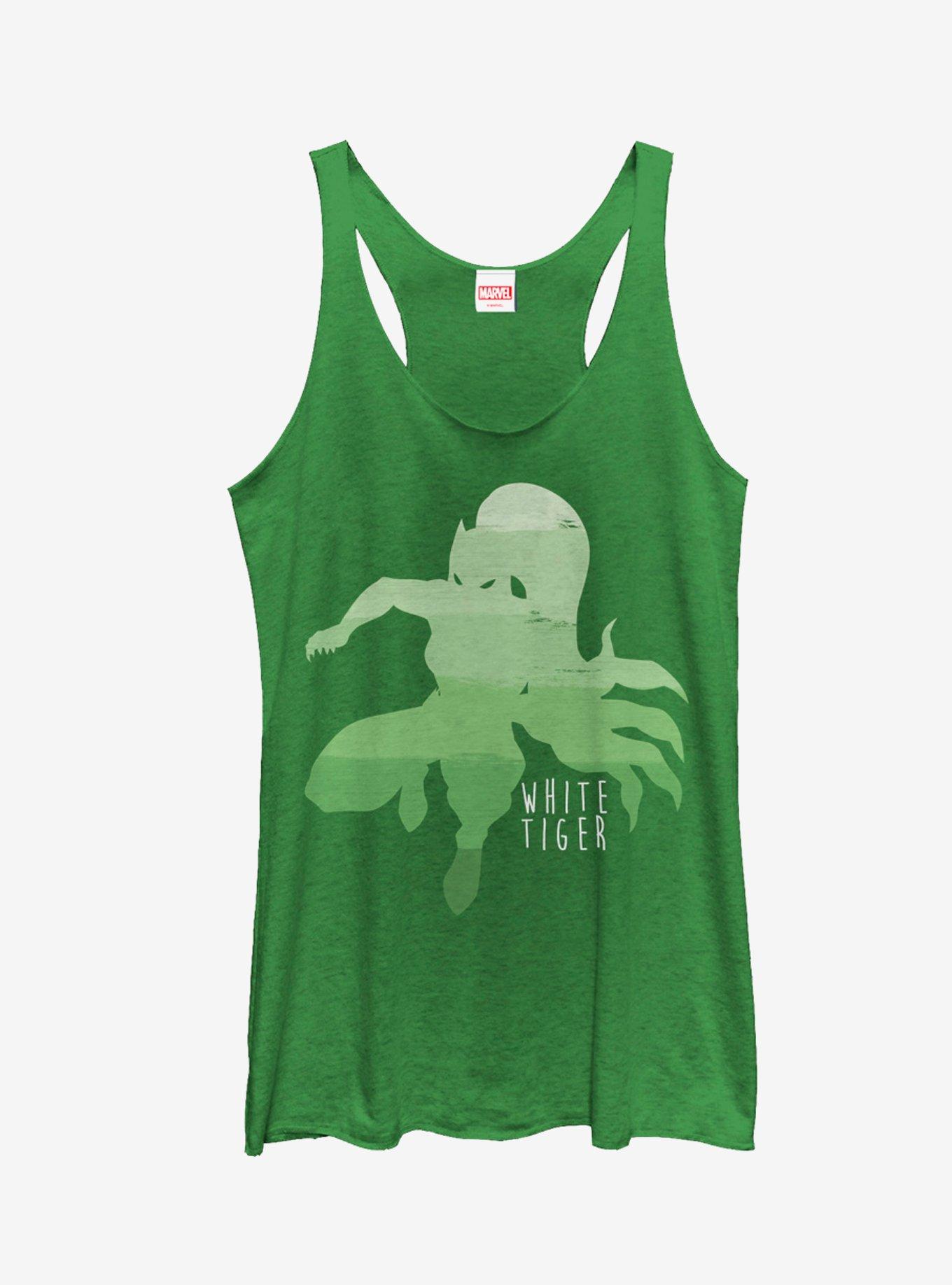 With her razor sharp claws, you won't want to go up against the Marvel White Tiger Claws Heather Green Racerback Tank Top. A silhouette of the White Tiger is printed in an ombre style that fades from light green to dark green down this soft green Marvel top. 50% Polyester, 25% Cotton, 25% Rayon.