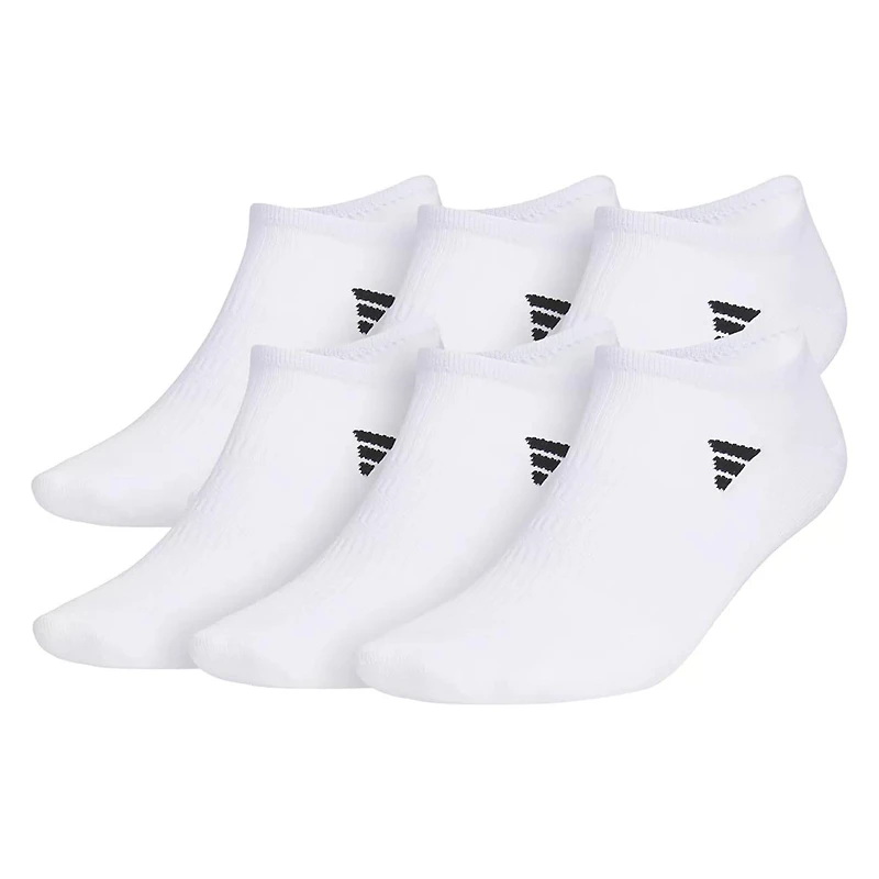 - Made of lightweight moisture-wicking yarn Six pack of no show socks Adidas logo detail Arch compression to help support feet Machine washable L fits men's shoe size 6-12
