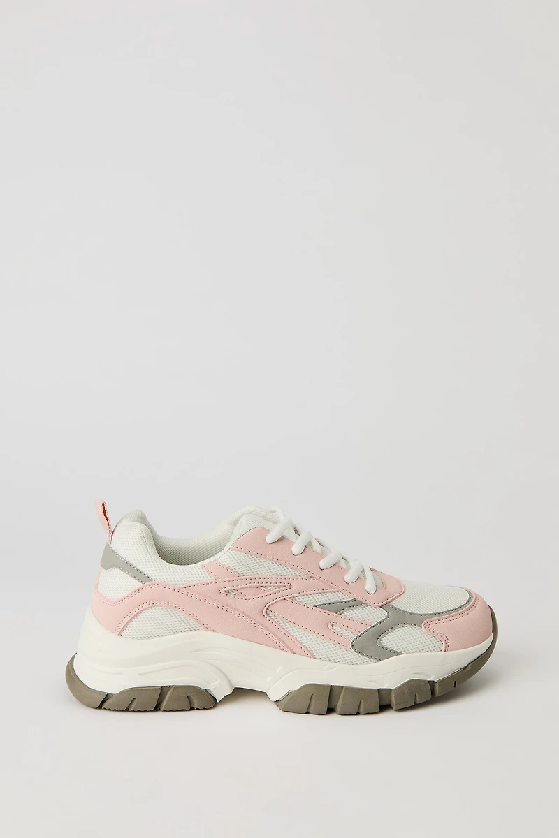 This shoe features faux-leather & mesh material, lace-up front, pull tab, and chunky sole. Pictured Size: 9 Imported