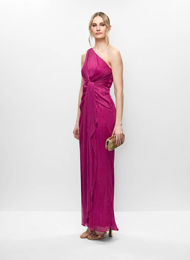 Metallic One-Shoulder Gown & Graduated Chandelier Earrings