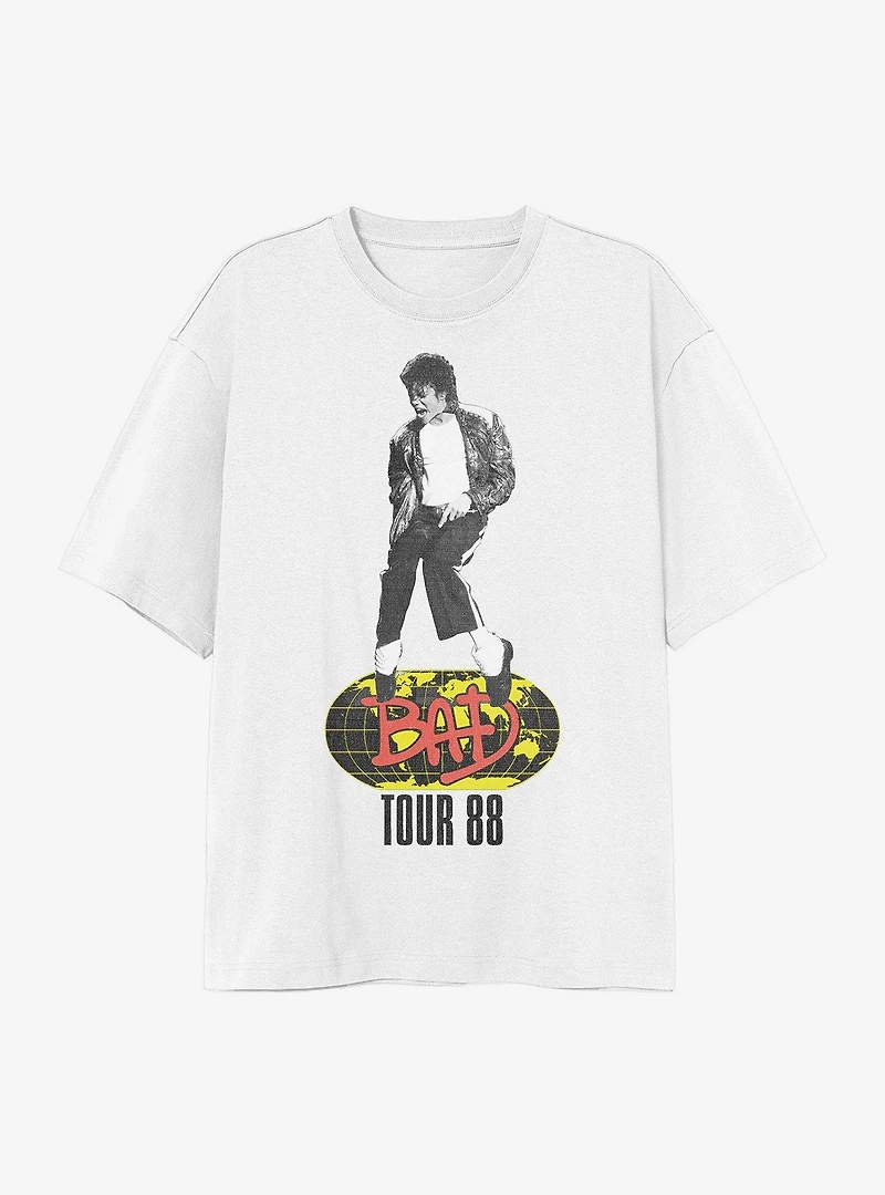 You're bad, and we know it -- what's why you need this replica 1988 tee repping Michael Jackson's Bad (1987). It shows a faux-distressed graphic of the King of Pop dancing on a globe with the album name and "Tour 88" below. Please note: Style runs large; size down for a tighter fit.