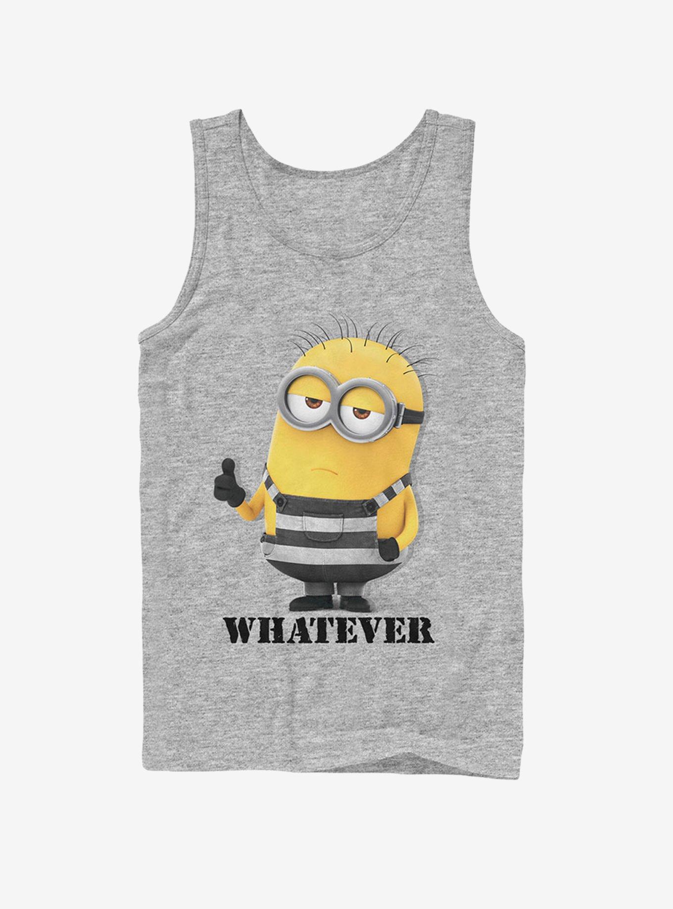 What's black, white, and yellow all over? A Minion spending the night in the jailhouse with the Despicable Me 3 Minion Whatever Prisoner Men's Tank Top. A Minion wearing a striped prison uniform gives a thumbs-up with "Whatever" below on this funny Minions muscle tee.