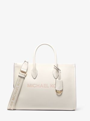 Crafted from pebbled leather in a structured silhouette, the mirella tote features our iconic brand lettering and a polished logo charm for an ultra-luxe finish. With sleek top-handles and a woven crossbody strap, this bag will be your new daytime go-to. Wear it with denim and a classic white shirt.