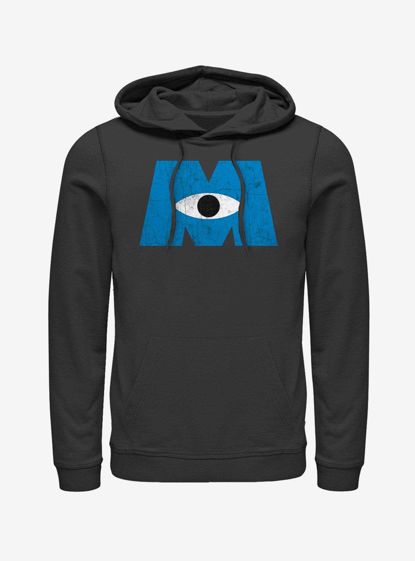 Join your favorite scarers Mike and Sulley with the Monsters Inc Eye Logo Black Lightweight Hoodie! A blue "M" with an eye, also known as the Monsters Inc logo, is printed in a distressed style on the front of this cool black Monsters Inc hoodie. 50% Cotton, 50% Polyester.