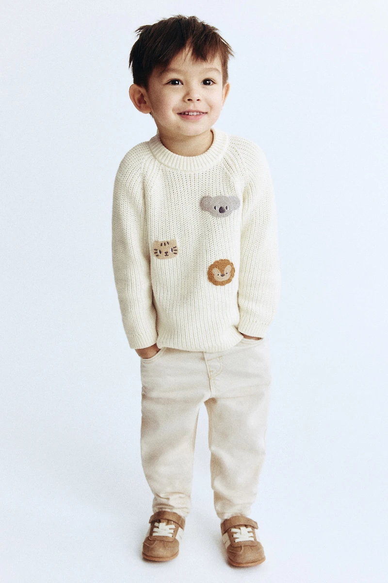 Patent-knit sweater in soft cotton with crochet-look appliqués at front. Round neckline, opening behind one shoulder with buttons, and long raglan sleeves. Ribbing at neckline, cuffs, and hem.
