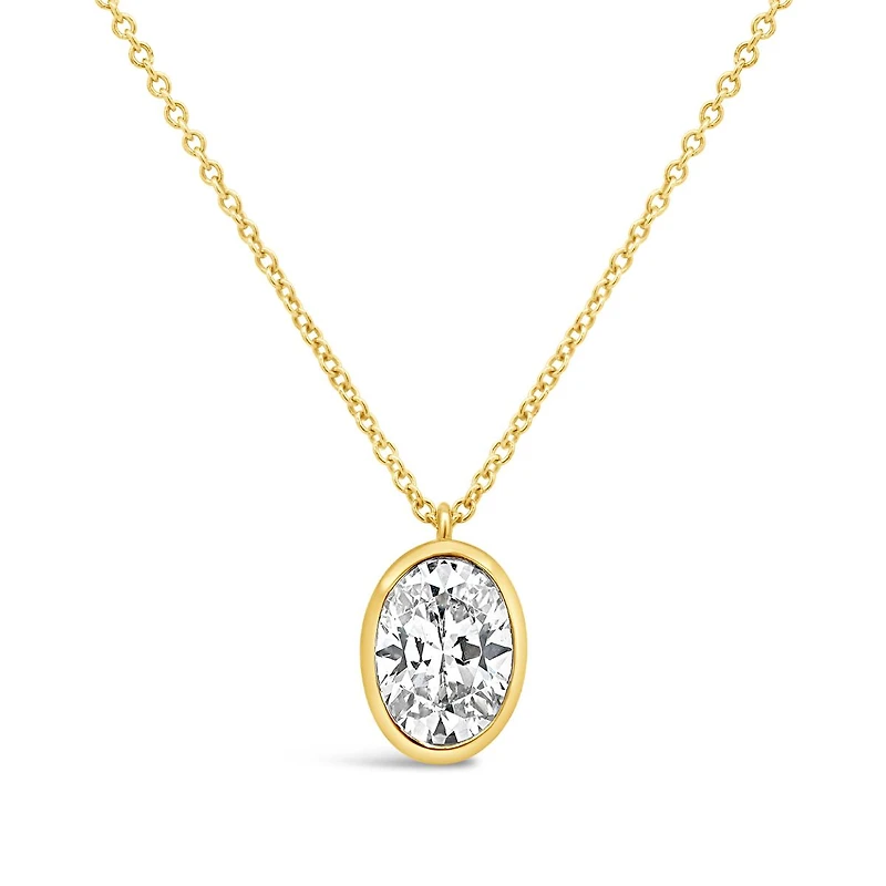 Modern elegance meets timeless design in this New Brilliance pendant, showcasing a 1.00 carat lab-grown oval diamond in a sleek bezel setting. Crafted in 10K yellow gold, the polished frame gently embraces the diamond, enhancing its brilliance while offering a clean, contemporary silhouette. Suspended from a coordinating gold chain, this pendant is a radiant expression of refined style and ethical luxury.