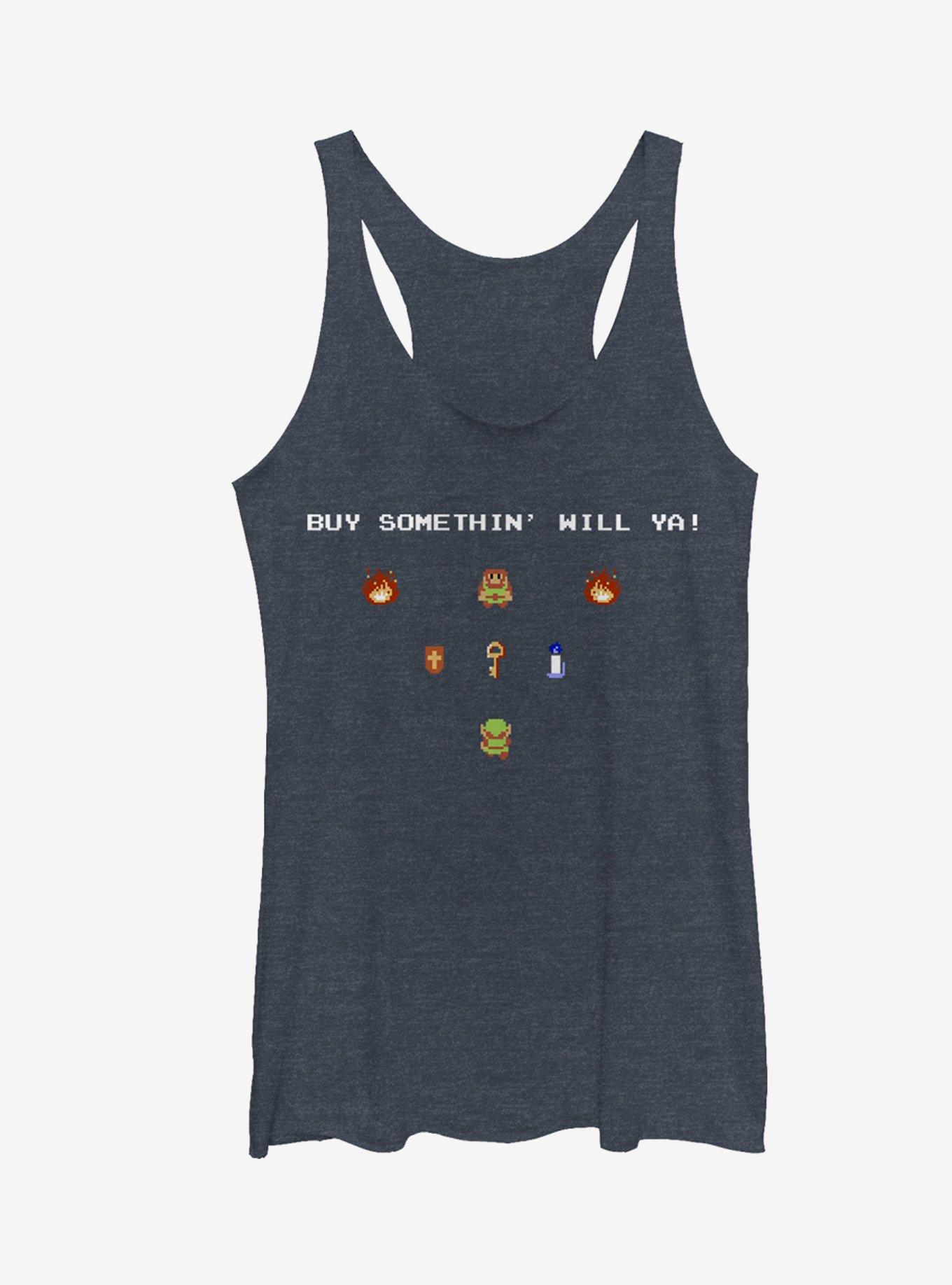 If you have enough Rupees then head to one of the merchant's stores for a Magical Shield on the Nintendo Legend of Zelda Merchant Buy Something Heather Navy Blue Racerback Tank Top. A pixelated Link considers buying a Blue Candle, a Magical Shield, or a Key while an impatient merchant demands "Buy Somethin' Will Ya!" on this blue Link tank top. 50% Polyester, 25% Cotton, 25% Rayon. Designed with raw-edge hems.
