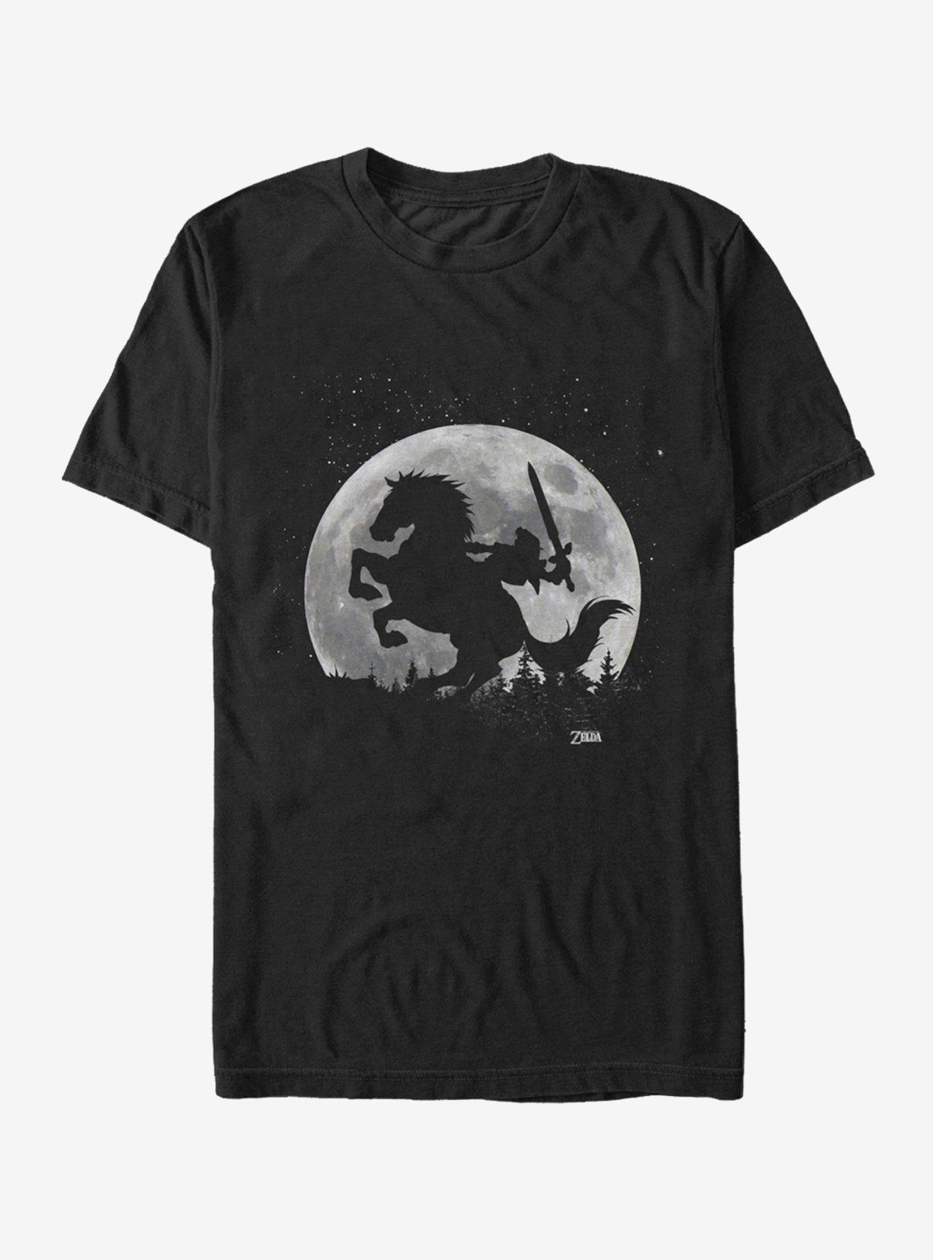 Link's trusty steed, Epona, is always by his side when he needs her on the Nintendo Legend of Zelda Moon Black T-Shirt. A profile of Link on his horse with the moon in the background is printed across this black Zelda shirt. 100% Cotton.