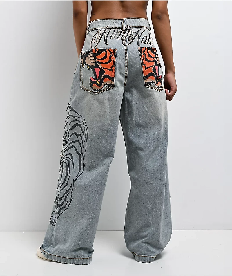 Designed with a washed blue finish, the Tiringa Growl jeans from Ninth Hall showcase a prowling tiger graphic around the leg and matching artwork across the seat pockets. Heavy contrast stitching adds structure throughout the silhouette. The wide leg