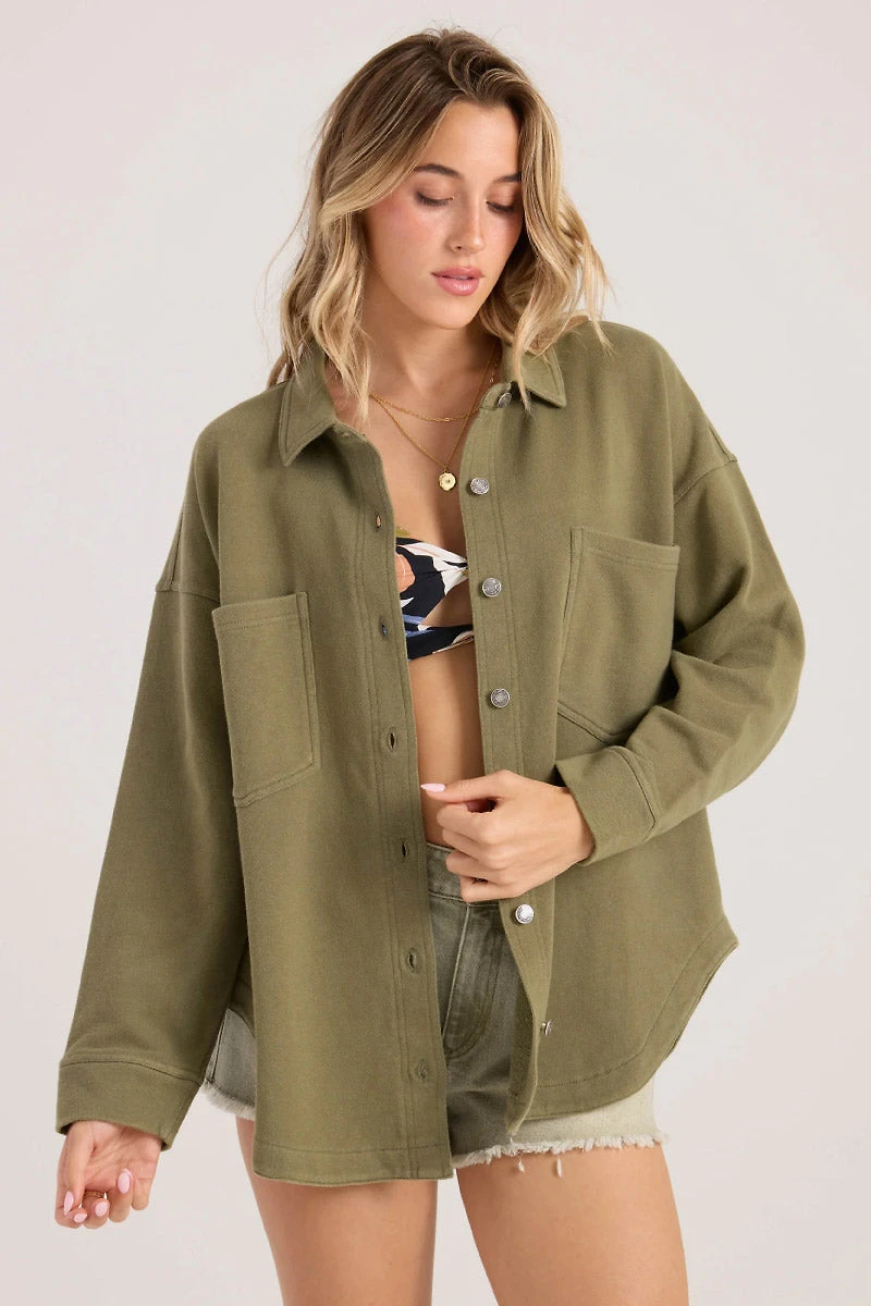 The Volcom Nollie is soft like a hoodie but built like a jacket. This oversized, 100% cotton French terry shacket features a loose drop-shoulder fit and a washed Bayleaf finish for a broken-in feel. With a classic button front and roomy patch pockets, it’s the perfect easy-throw-on for coffee runs or skate sessions.