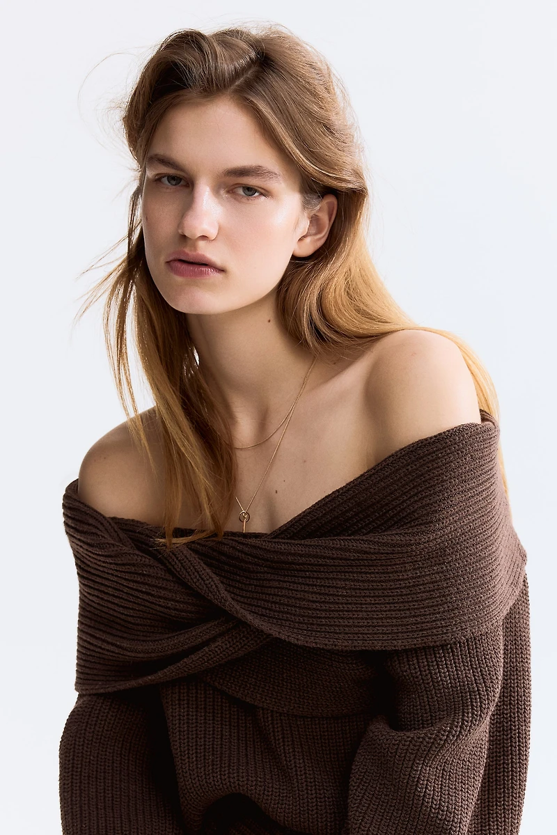 Off-the-shoulder sweater in a rib knit with a twisted foldover upper edge. Ribbed cuffs.