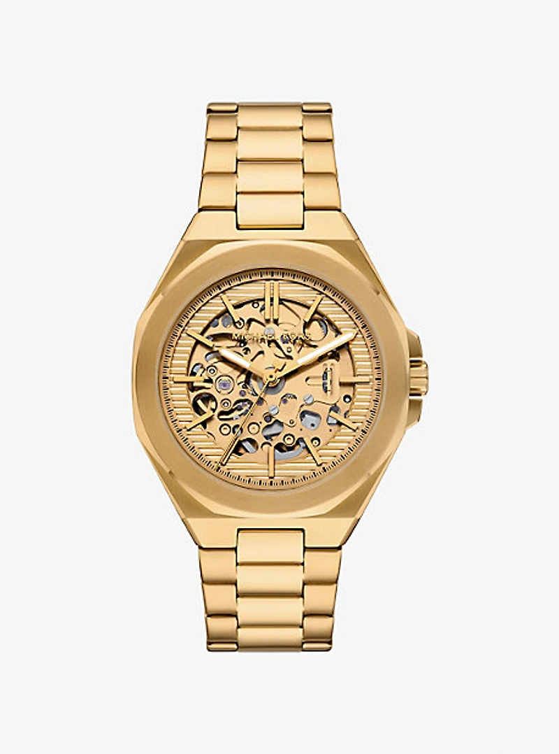 Watch, stainless steel, gold-tone hardware, oversized, 41mm case, automatic/3-hand movement, clasp fastening, water resistant up to 5 atm, 2-year warranty, imported