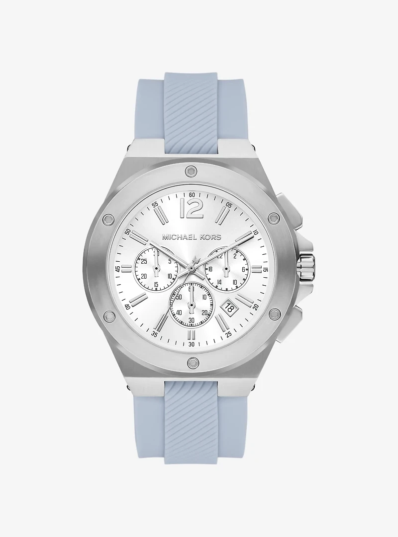 Watch, stainless steel/silicone, silver-tone hardware, oversized, 45mm case, quartz/chronograph movement, buckle fastening, water resistant up to 5 atm, 2-year warranty, imported